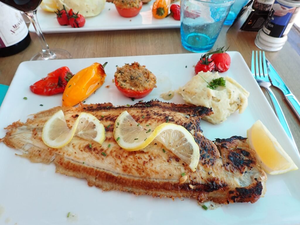 When the plat du jour (the dish of the day) is sole meuniere, there is no discussion. A very simple dish, whole sole pan fried in a brown butter sauce finished with lemon and parsley, this is irresistible. Other highlights have included moules Roquefort (mussels in a Roquefort cheese sauce) and seiche al la plancha en persillade (grilled cuttlefish with parsley). If I thought I might have lost a little of the weight I gained in Rome while we were in Provence, I’m pretty sure I’ve found it again!